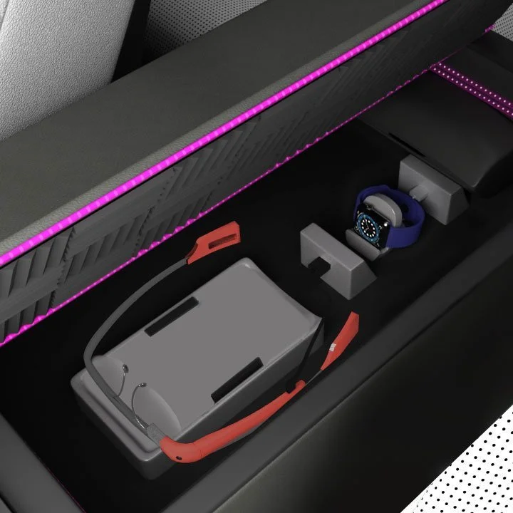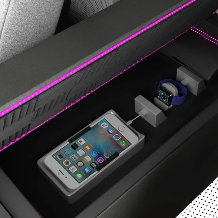 SmartSafe is an advanced “smart start” system that enhances vehicle safety by ensuring all driver devices—smartphone, Apple Watch, and smart glasses—are securely stored in the center console and the driver is wearing their seatbelt before the vehicle can shift into drive. The console features UV lighting to disinfect gadgets and an EMF-shielding battery to reduce radiation exposure. For navigation, drivers can utilize Apple CarPlay or Android Auto. Additionally, the SmartSafe Console integrates seamlessly with home automation systems. Equipped with a transmitter, it syncs effortlessly to trigger preset actions upon your arrival, such as opening the garage door or activating lighting scenes. This intelligent connectivity streamlines entry and reinforces the console’s versatility, making it a standout feature in modern vehicles. Its ability to bridge automotive and home automation systems sets a new standard for integrated living.