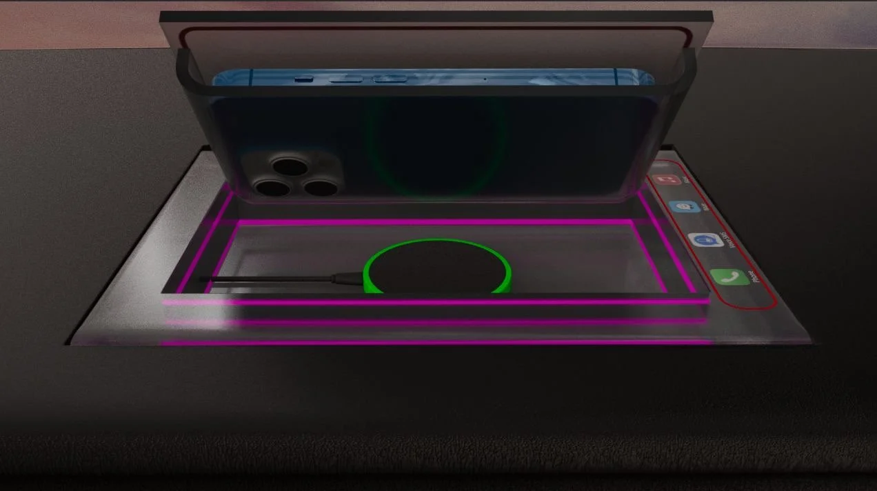 The SmartSafe Tray enhances both safety and convenience on the road. With a quick double press, it opens to reveal a cassette-style compartment. When a smartphone is placed on the built-in wireless charger inside the closed cassette player, the vehicle can start—ensuring the device is securely stored before driving. The tray, or cassette player, is acoustically sealed, silencing all incoming notifications to minimize distractions. It also supports Apple CarPlay, providing seamless access to navigation, calls, and music directly through the infotainment system without handling the phone. A tinted cover discreetly conceals the device, further reducing visual distractions. The SmartSafe Tray is a breakthrough innovation meticulously engineered to eliminate distracted driving once and for all.