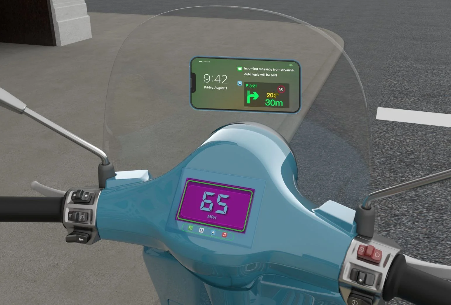 The SmartSafe Cassette Player puts safety first: a scooter’s engine won’t start unless the rider’s smartphone is locked inside, preventing texting while riding. For convenience, it’s mounted at the center of the handlebar with an LED ring that glows red when empty and green when the phone is secured, ensuring the device is locked, protected, and charging. The façade display shows speed, fuel level, and navigation, while a navigation button projects directions as a HUD on the windshield, helping riders stay focused on the road. For added peace of mind, SmartSafe provides auto text replies, hands-free Bluetooth helmet calls, and real-time driving behavior tracking through the SmartSafe app.
